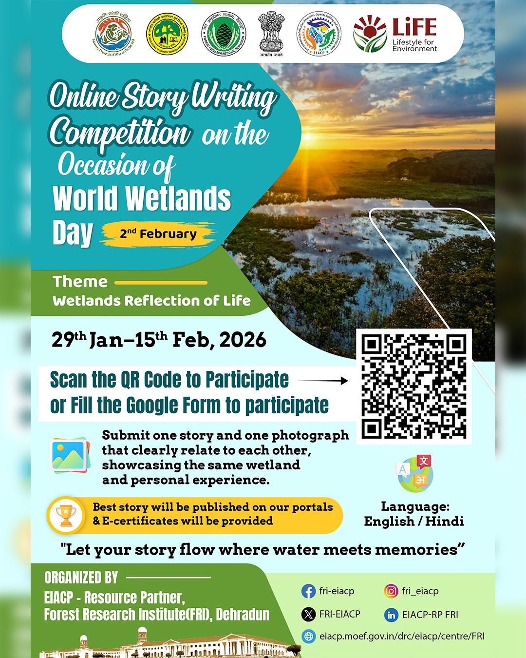 EIACP-RP, Forest Research Institute (FRI), Dehradun is hosting an Online Story Writing Competition to celebrate World Wetlands Day, with submissions open from 29 January to 15 February 2026. Participants are invited to share original stories that highlight the importance of wetlands by blending personal memories with their ecological significance. Entries can be submitted through the Google Form link: https://forms.gle/kmzTeqS4HE5w5jz59