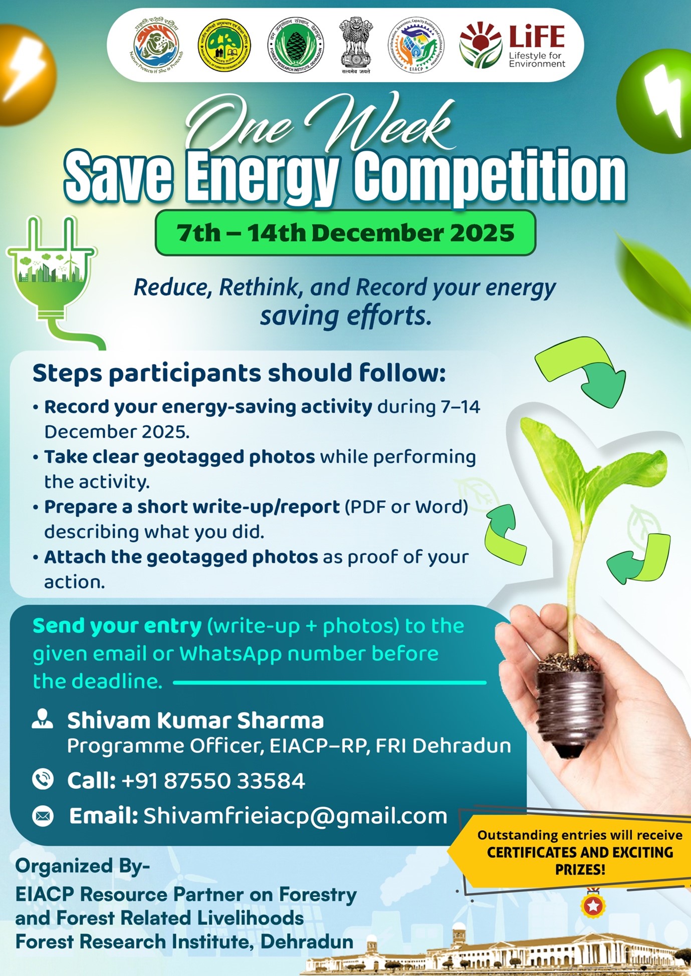 EIACP RP FRI Dehradun launched a one-week Save Energy Competition from 7–14 December 2025 to promote simple, daily energy-saving actions under Mission LiFE. Participants are required to perform an energy-saving activity, submit geotagged photos, and provide a short write-up. The initiative encourages responsible energy use, and the best entries will be awarded certificates and prizes.
