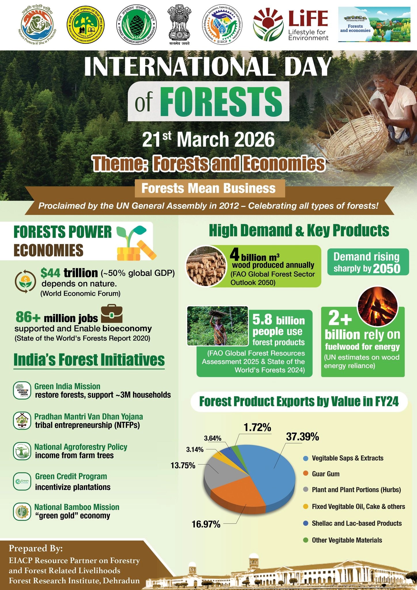 EIACP RP FRI Dehradun released an infographic on March 21, 2026, for “International Day of Forests 2026” on the theme “Forests and Economies.” It highlights forests’ contributions to global and Indian economies, green jobs, livelihoods, and ecosystem services, supporting Mission LiFE sustainable awareness.